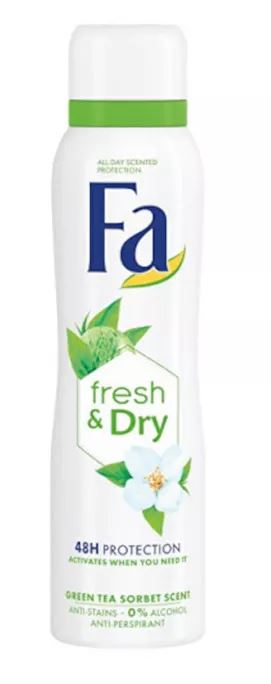FA Women Fresh & Dry Green Tea je osviežujúci dámsky deodorant v spreji s revitalizujúcou vôňou zeleného čaju. Pokročilá formula poskytuje až 48-hodinovú ochranu proti potu a zápachu, zatiaľ čo unikátna technológia Fresh & Dry zabezpečuje pocit suchosti a sviežosti po celý deň. Ideálne riešenie pre aktívne ženy, ktoré hľadajú spoľahlivú ochranu a prírodne inšpirovanú vôňu.