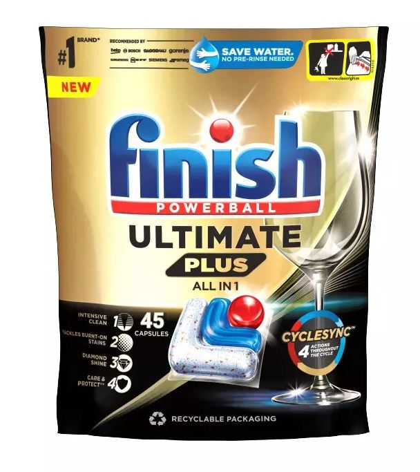 Finish Regular ULTIMATE PLUS tabs predstavujú najvýkonnejšie tablety do umývačky riadu z portfólia Finish. Revolučná trojvrstvová formula s CycleSync technológiou uvoľňuje čistiace zložky presne v správnom čase počas umývacieho cyklu, čím zabezpečuje dokonalé výsledky aj pri najnáročnejších nečistotách. Tablety obsahujú integrované leštidlo a soľ, takže nepotrebujete žiadne prídavné produkty.