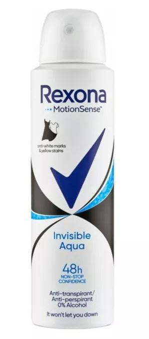 Rexona Women Invisible Aqua je dámsky antiperspirantový sprej, ktorý poskytuje 48-hodinovú ochranu proti poteniu a zápachu. Je špeciálne vyvinutý tak, aby nezanechával biele stopy na oblečení a má sviežu vodnú vôňu.