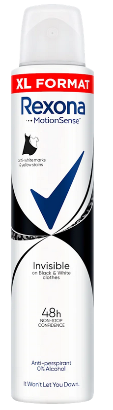 Rexona DEO Women Invisible Black & White 200 ml je pokročilý antiperspirantový deospray špeciálne vyvinutý pre ženy, ktorý poskytuje 48-hodinovú ochranu proti poteniu a nepríjemnému zápachu. Jedinečná formula Invisible Black & White chráni tmavé oblečenie pred bielymi škvrnami a svetlé oblečenie pred žltými škvrnami, ktoré spôsobuje pot. Obsahuje technológiu MotionSense™, ktorá sa aktivuje pri pohybe a uvoľňuje vôňu po celý deň. Jemná, rýchlo schnúca formula je dermatologicky testovaná a vhodná pre pravidelnú dennú starostlivosť.